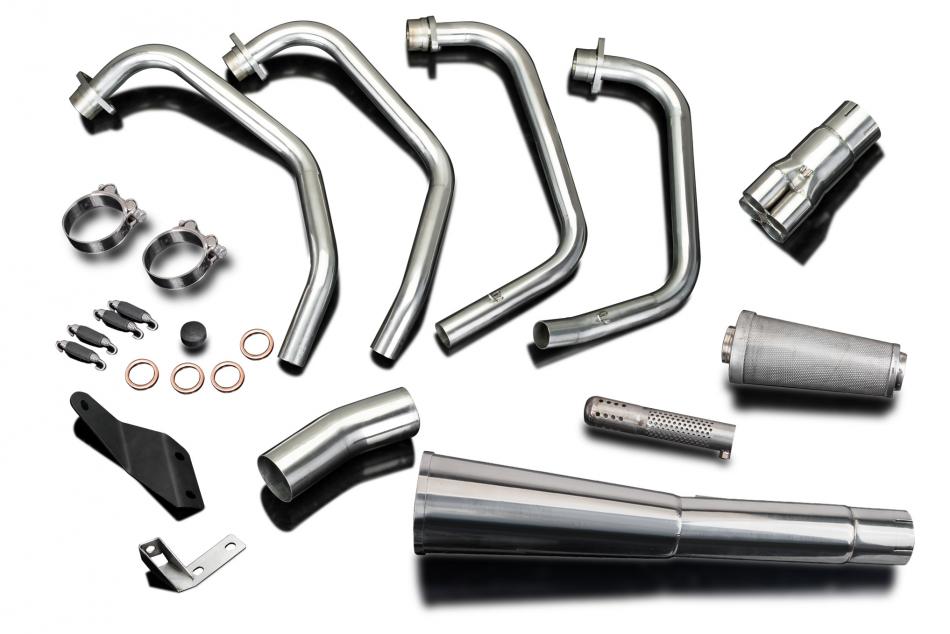 Doté de descentes en acier inoxydable et du silencieux Megaphone classique de Delkevic, ce système est fabriqué à la main avec des matériaux de première qualité et conçu pour s’adapter aux motos classiques d’antan. Grâce à un système de chicanes à cartouche à 3 étages, vous pouvez régler la sonorité de l’échappement selon vos envies.