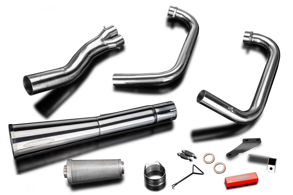 Doté de descentes en acier inoxydable et du silencieux Megaphone classique de Delkevic, ce système est fabriqué à la main avec des matériaux de première qualité et conçu pour s’adapter aux motos classiques d’antan. Grâce à un système de chicanes à cartouche à 3 étages, vous pouvez régler la sonorité de l’échappement selon vos envies.
